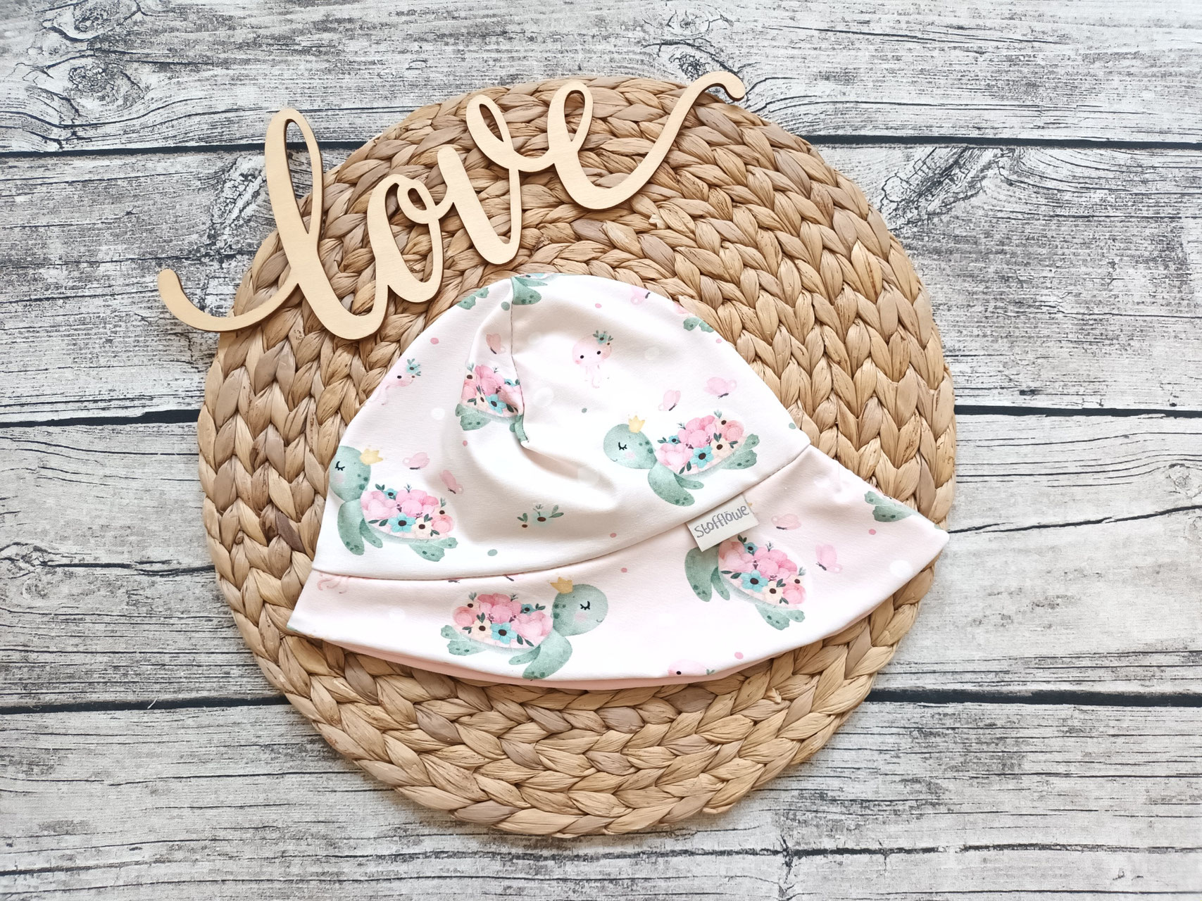 Toller Sonnenhut mit verlängerter Krempe in der Nackenpartie, dass diese auch gut geschützt ist von der Sonne. Der Sonnenhut ist einlagig und die Krempe zweilagig genäht.